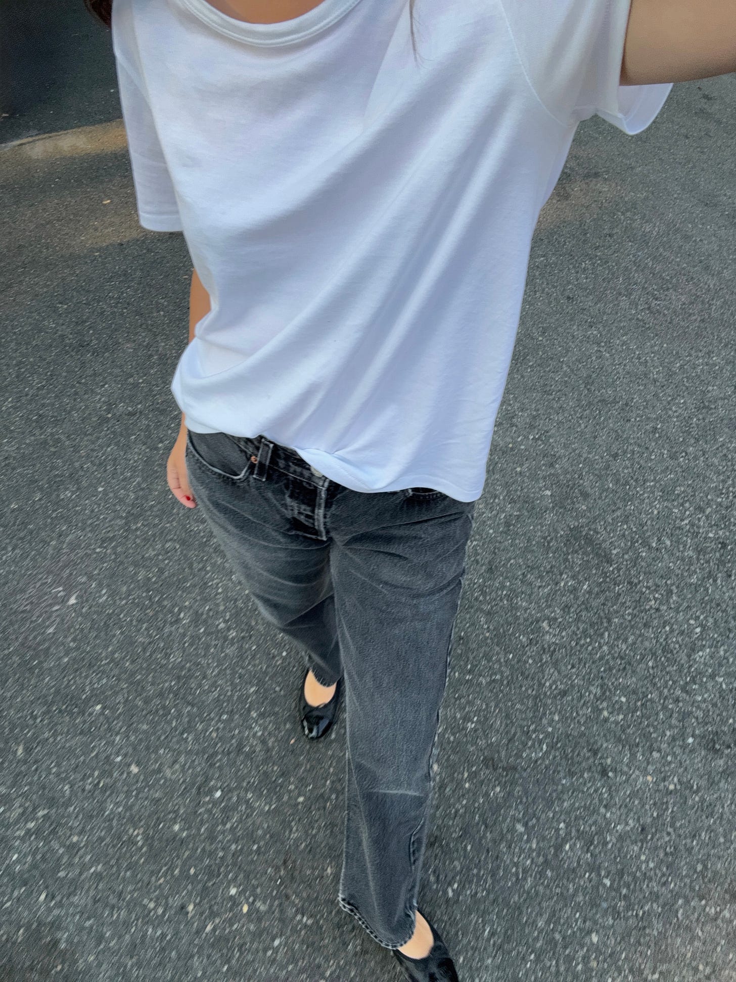 Last weekend, I hit up the Rose Bowl Flea Market in search of great vintage tshirts. As the attendant scanned my ticket, I kept telling myself, “no more vintage Levi’s.” I think I unlocked some kind of opposite manifestation, because I finally found the perfect pair of black vintage Levi’s. Fade, length, and fit were all right. They’re 501s from 2002 labeled 32x30, but the real measurements are 30x30 — the perfect low-waisted vibe.